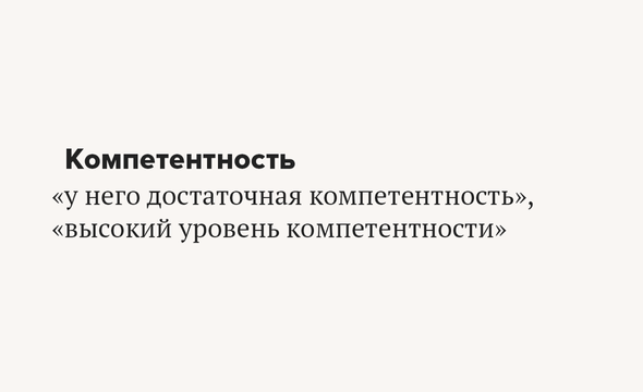 А вот «компетенция» — это круг вопросов и задач, которые готов решать компетентный специалист («Какая у тебя компетенция?»). Кроме того, компетенция — это набор полномочий какого-либо должностного лица или учреждения («На этом моя компетенция заканчивается», «Решение вопроса находится в компетенции школы»).
